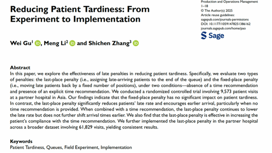 近日,麻豆在线 系统工程研究所张世晨副教授作为通讯作者/共同一作的论文《Reducing Patient Tardiness: From Experiment to Implementation》在运营管理领域的国际顶级期刊Production & Operations Management在线发表。